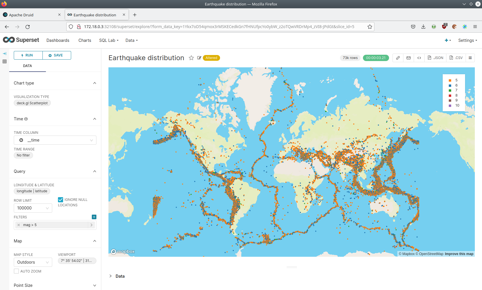 The demo streamed 10,000 earthquake records/s for a total of ~3 million earthquakes into a Kafka steaming pipeline. Druid ingested the data near real-time into its data source and enabled SQL access to it. Superset was used as a web-based frontend to execute SQL statements and build dashboards.